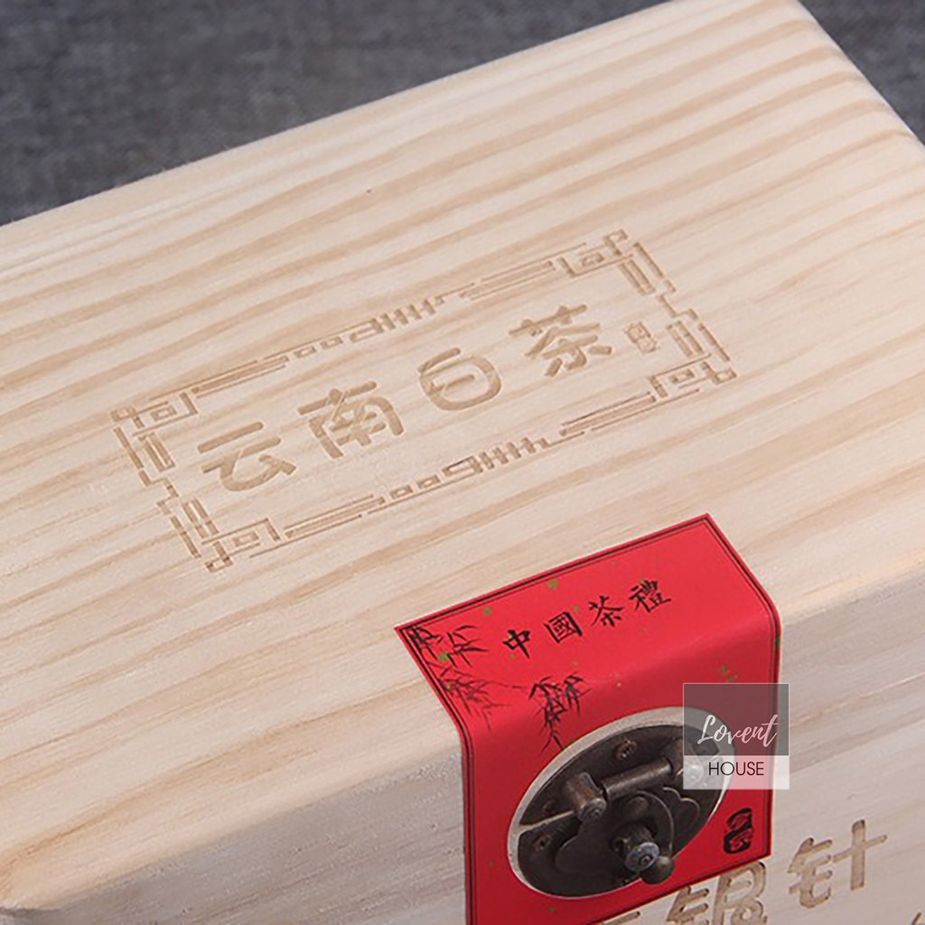 Hộp gỗ thiết kế chắc chắn, khóa cài đồng và hình khắc núi non mây trời tạo cảm giác truyền thống mà trang nhã. Mỗi hộp 500g thích hợp làm quà biếu dịp lễ Tết, thăm người thân, hay đơn giản là để dành uống mỗi ngày – như một cách chăm sóc bản thân trong yên bình.