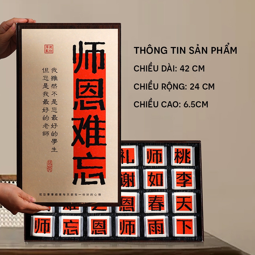 Được tuyển chọn từ những lá trà Phổ Nhĩ Chín thượng hạng tại Vân Nam, Trung Quốc, trà được ép thành 25 viên nhỏ, mỗi viên khắc một chữ thư pháp Hán Việt, tạo thành một bài thơ ý nghĩa về công ơn dạy dỗ. Bên ngoài là hộp gỗ cao cấp in tranh thư pháp "师恩难忘" (Ơn Thầy Khó Quên), có thể trưng bày như một bức tranh treo trang trọng.