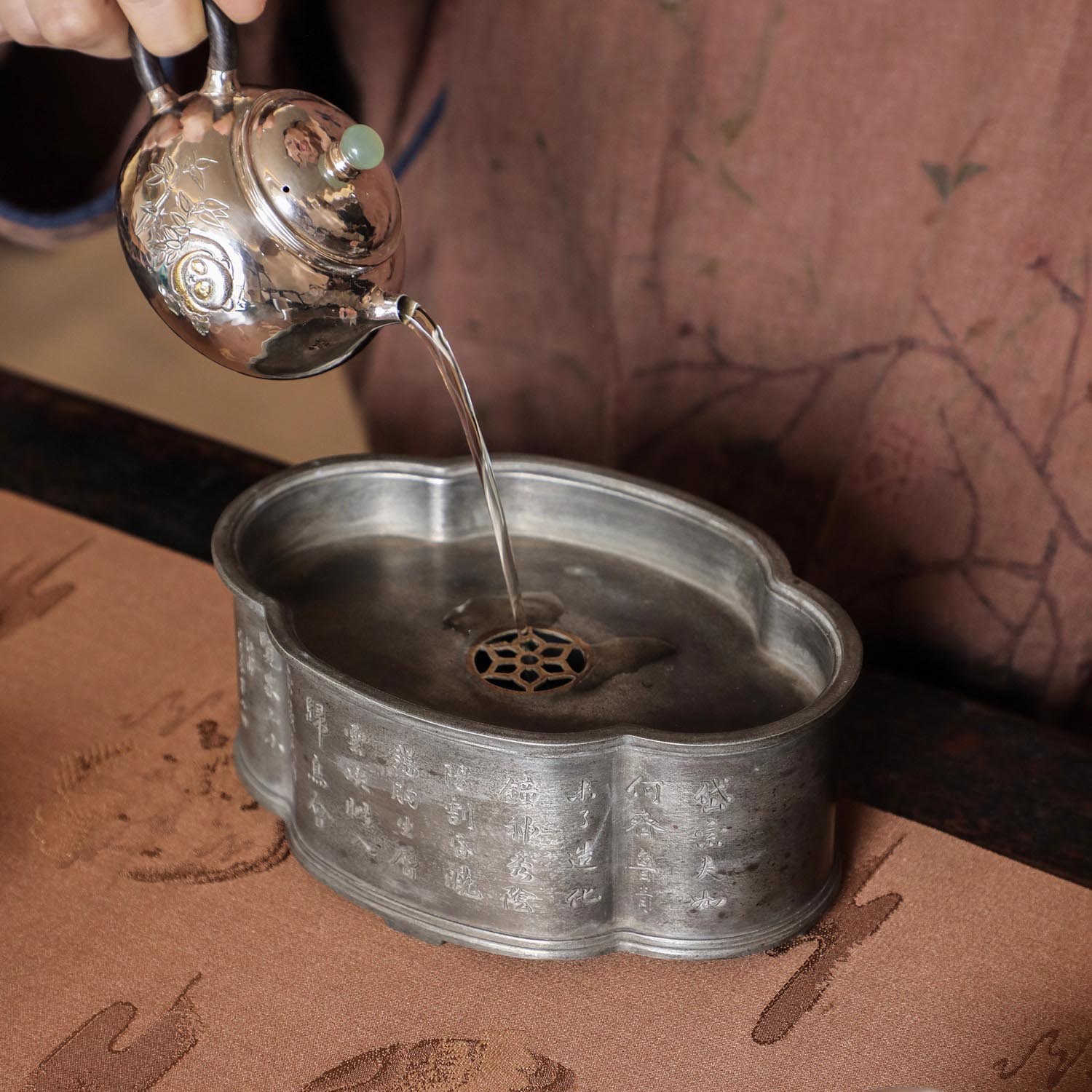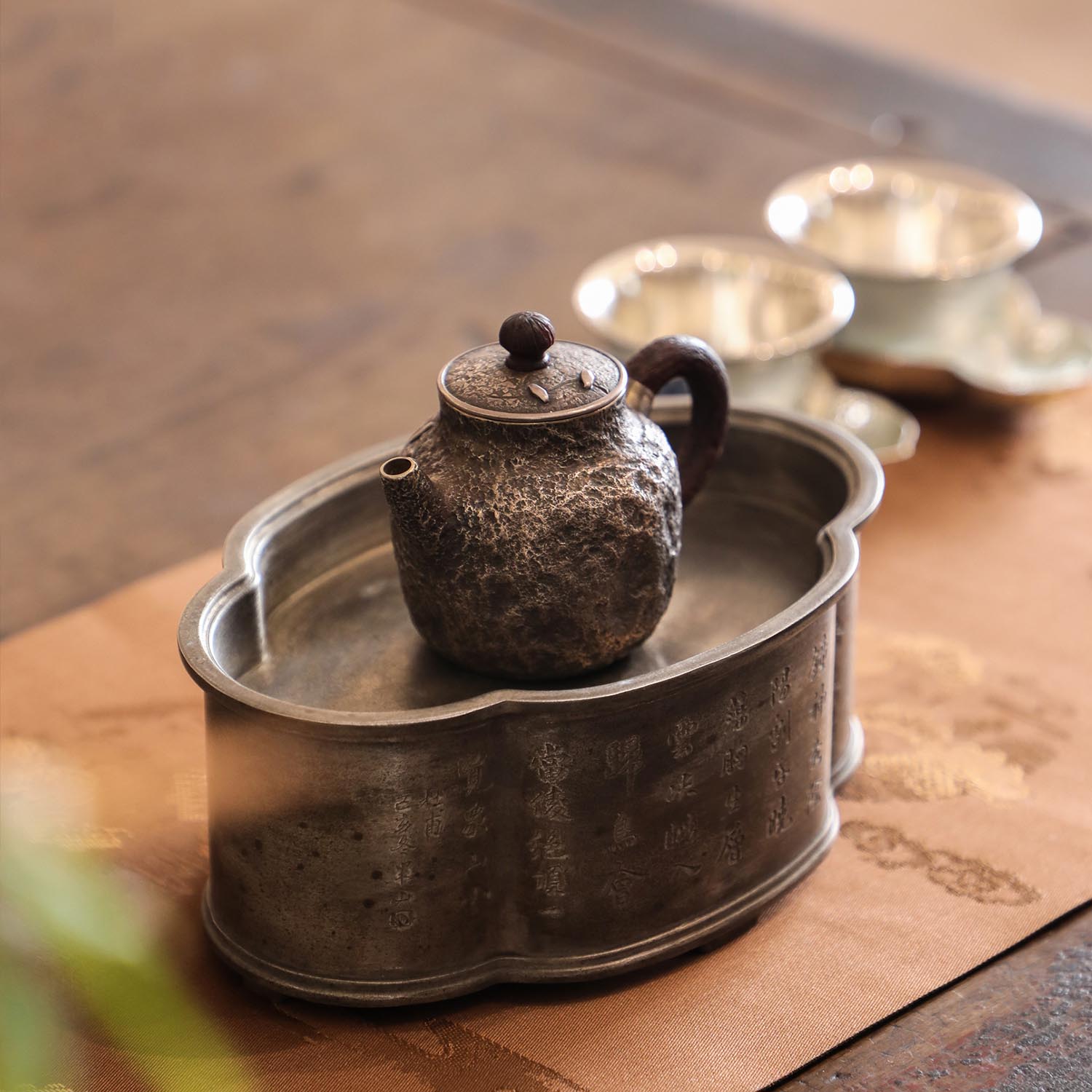 Khay Trà thiếc Vọng Nhạc Hải Đường khi đặt vào không gian tĩnh lặng như một góc trà thất, một kệ thiền, hay đơn giản là bàn trà bên cửa sổ nó thầm thì một thông điệp mà người xưa từng khắc cốt ghi tâm: