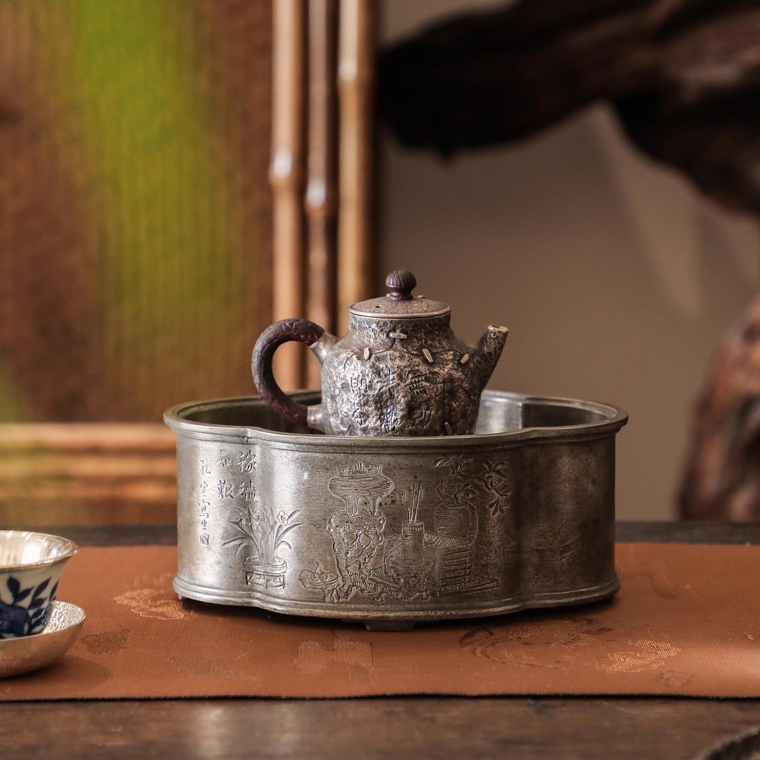 Khay thiếc Vọng Nhạc Hải Đường là một tuyệt phẩm phục chế theo phong cách cổ điển thời Thanh, tái hiện lại dáng dấp thanh nhã của dòng cung khí xưa. Sản phẩm được chế tác hoàn toàn bằng tay từ thiếc nguyên chất, kết hợp điêu khắc thủ công và khắc thơ cổ, đem lại giá trị thẩm mỹ và sưu tầm vượt thời gian.