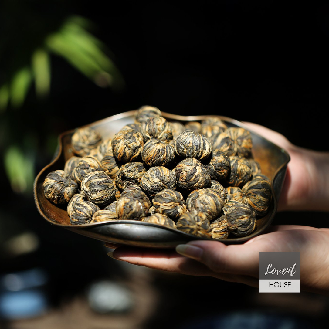 Trà được tạo hình viên tròn xinh đẹp như "long châu", có sắc vàng - đen xen kẽ tự nhiên, phản ánh rõ nét kỹ thuật chế biến truyền thống của người Hoa. Khi pha, mỗi viên trà bung nở như một bông hoa, mang lại trải nghiệm thị giác tinh tế và vị giác tròn đầy, sâu lắng.